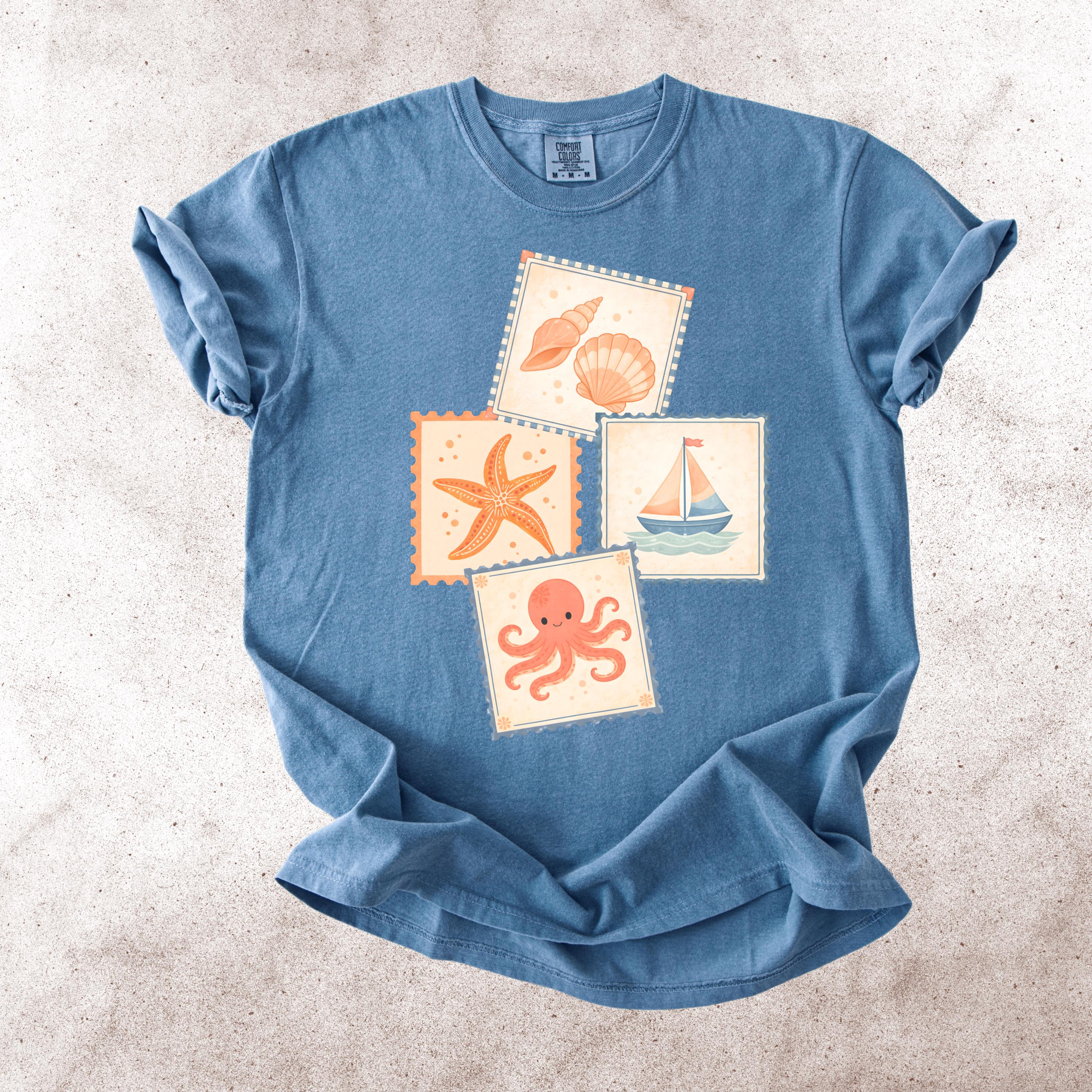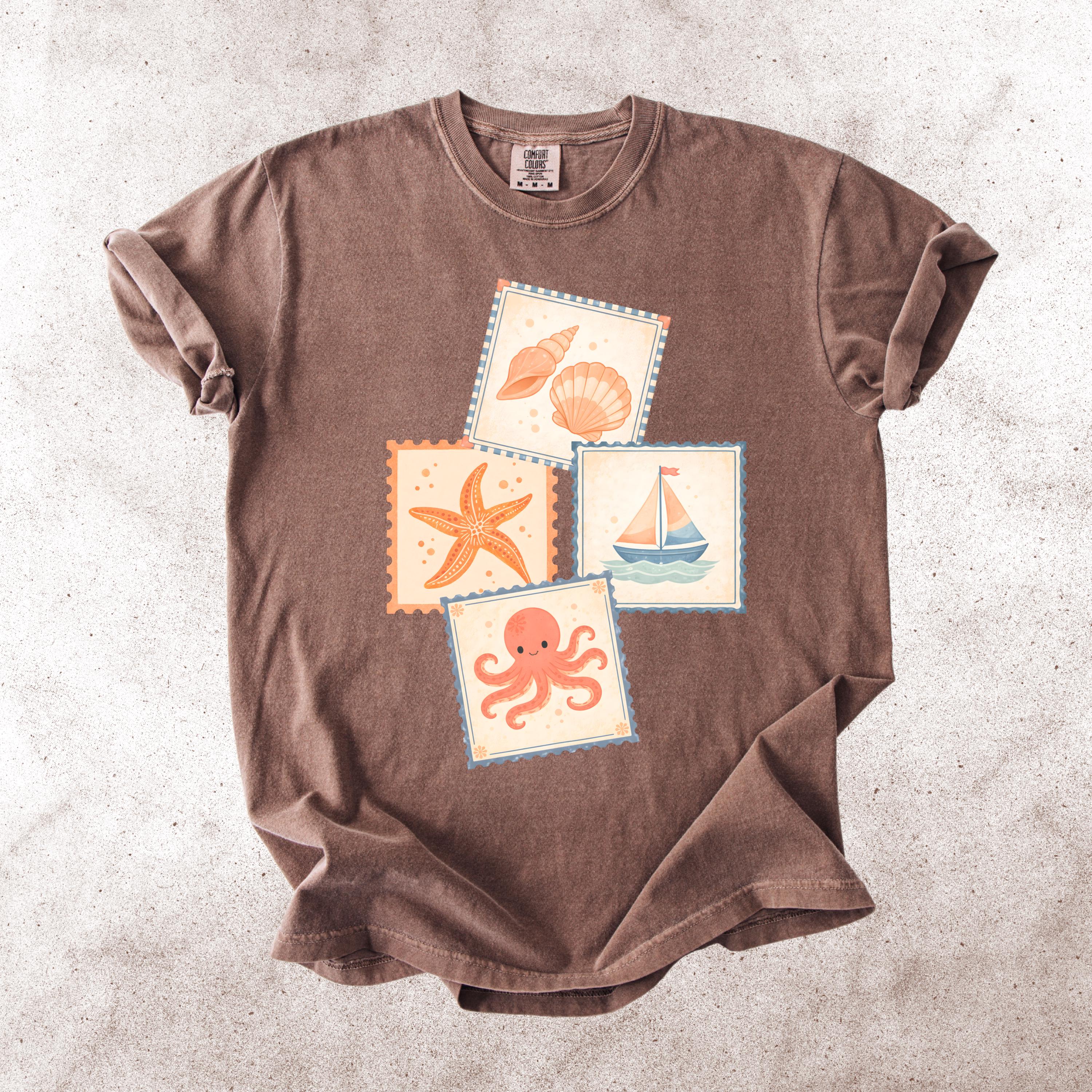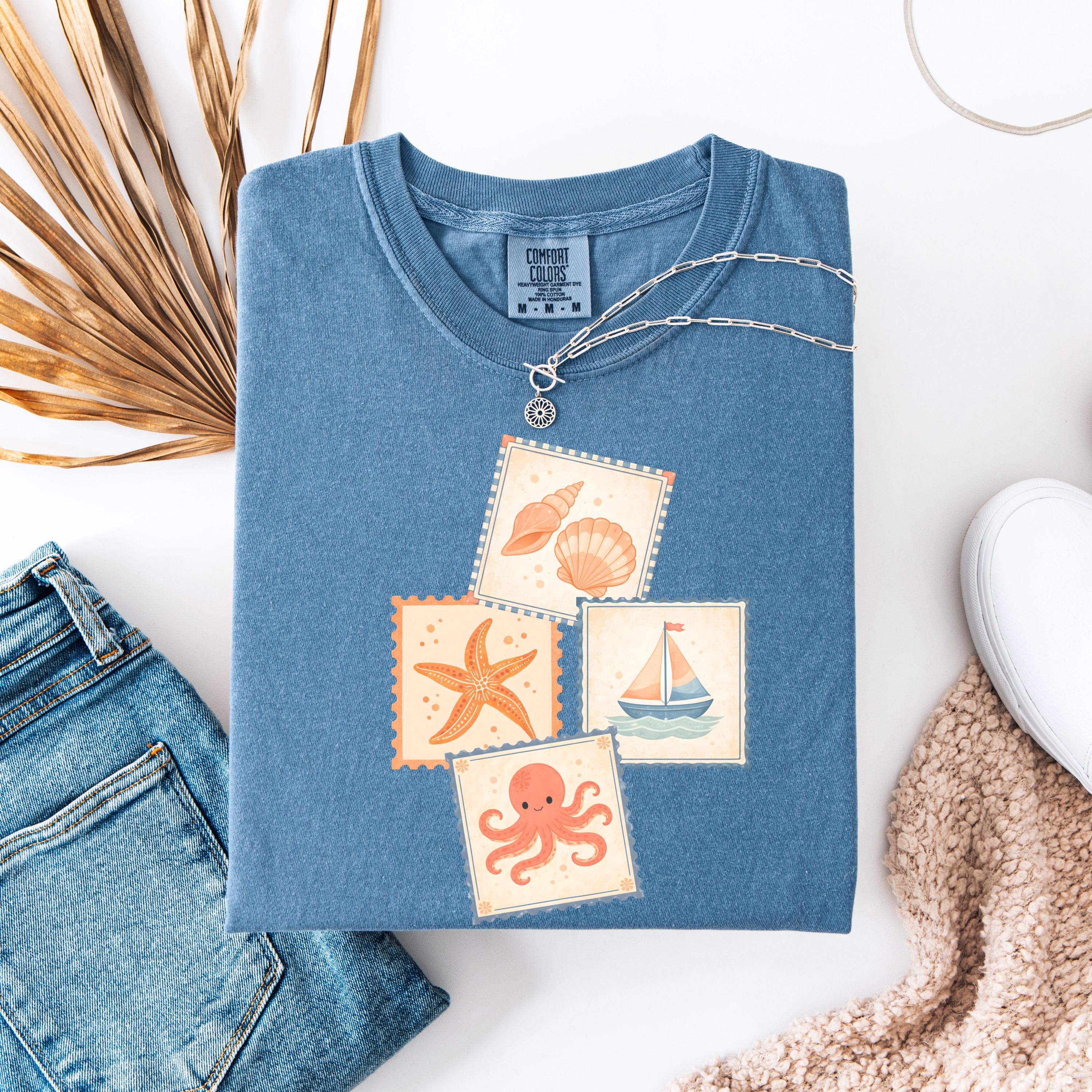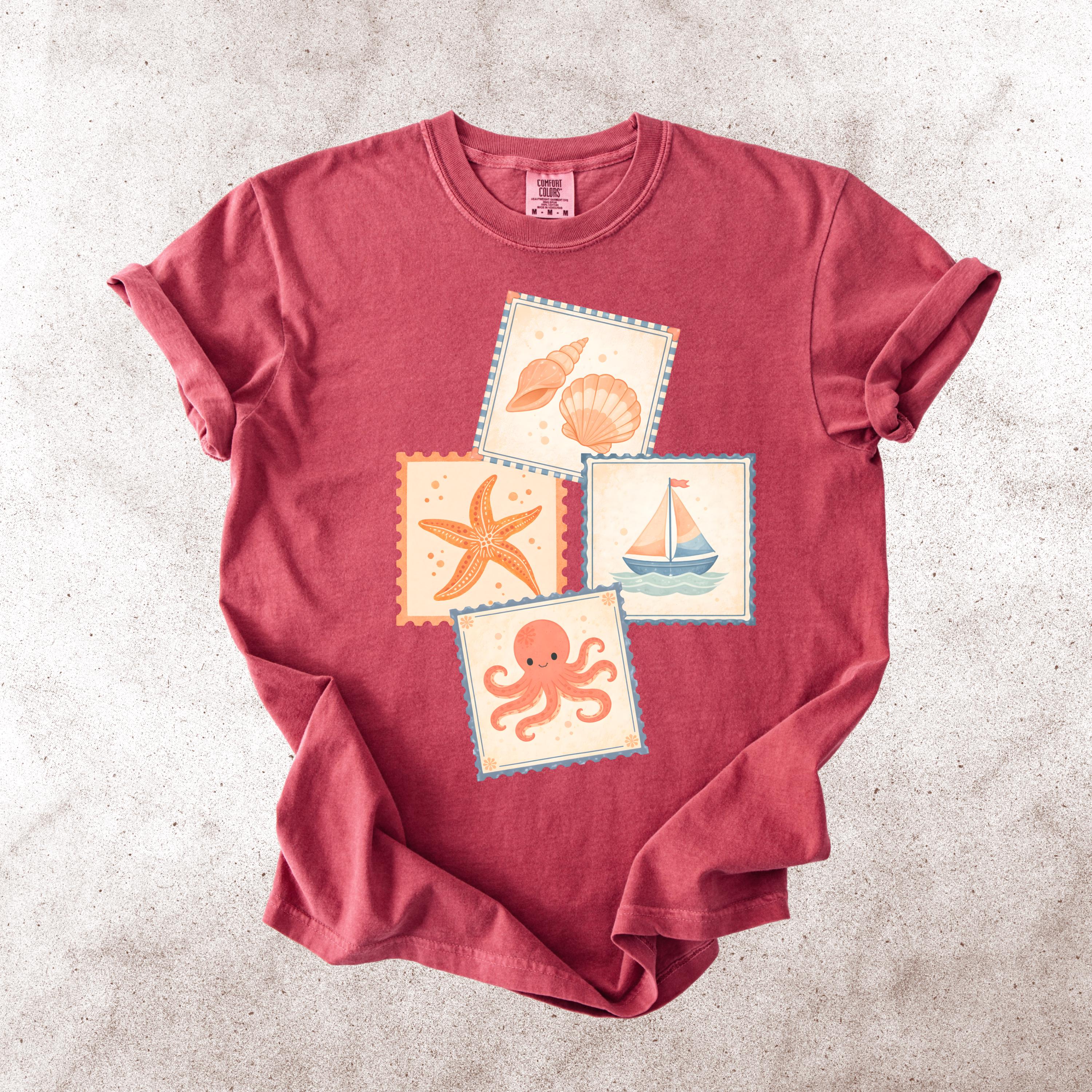 This soft, vintage-inspired design features a playful collection of coastal elements — seashells, starfish, sailboat, and a cute octopus — arranged in a charming stamp-style layout that feels like a postcard from your favorite seaside escape.