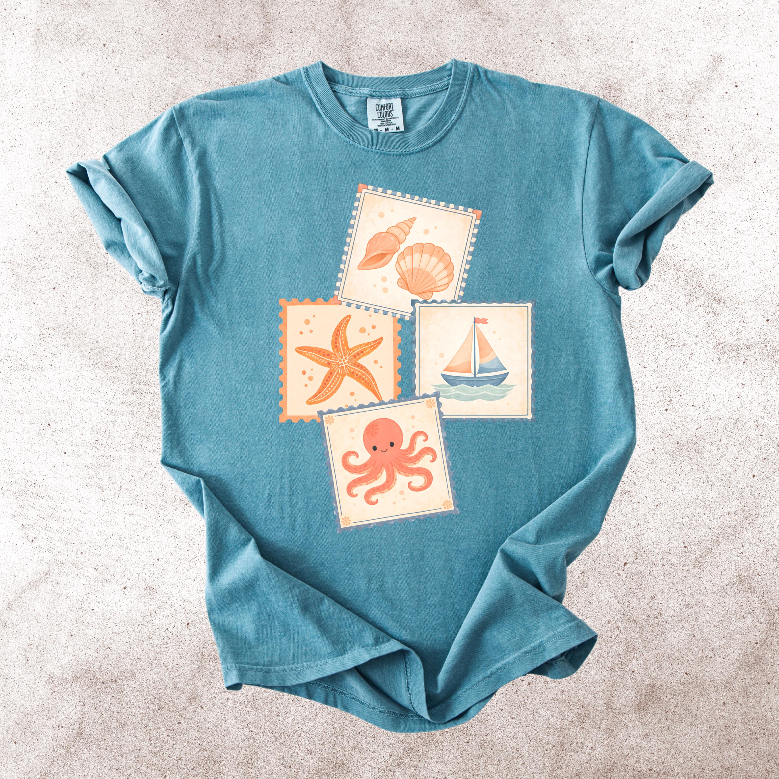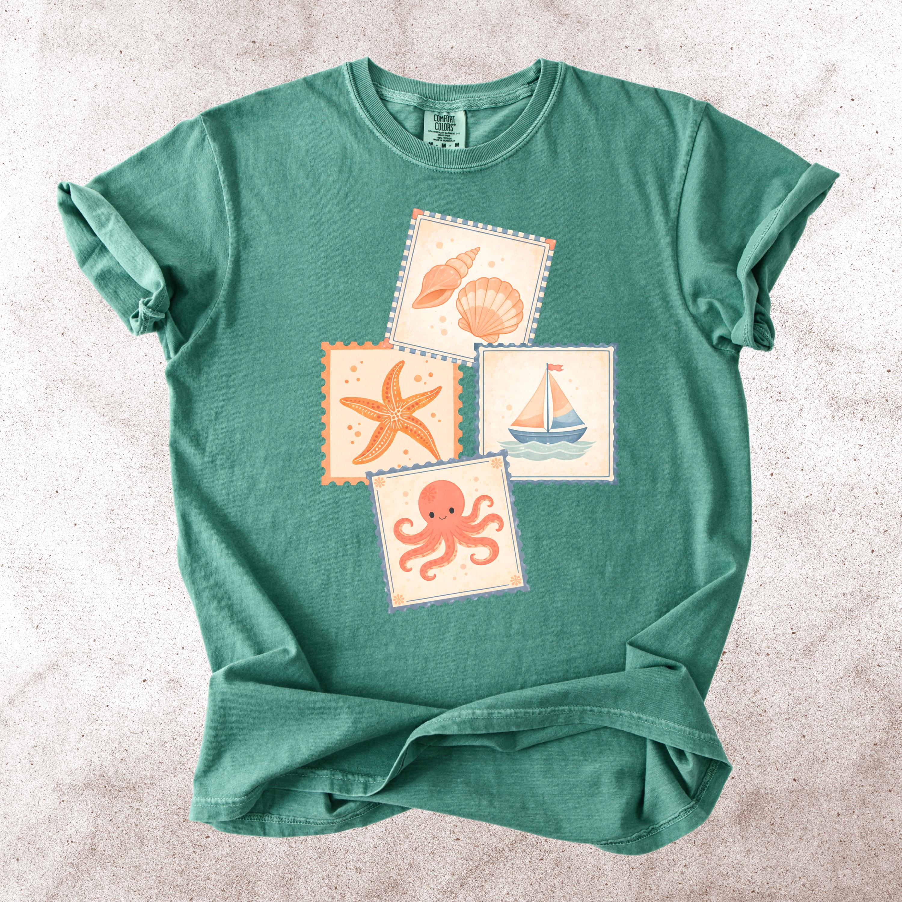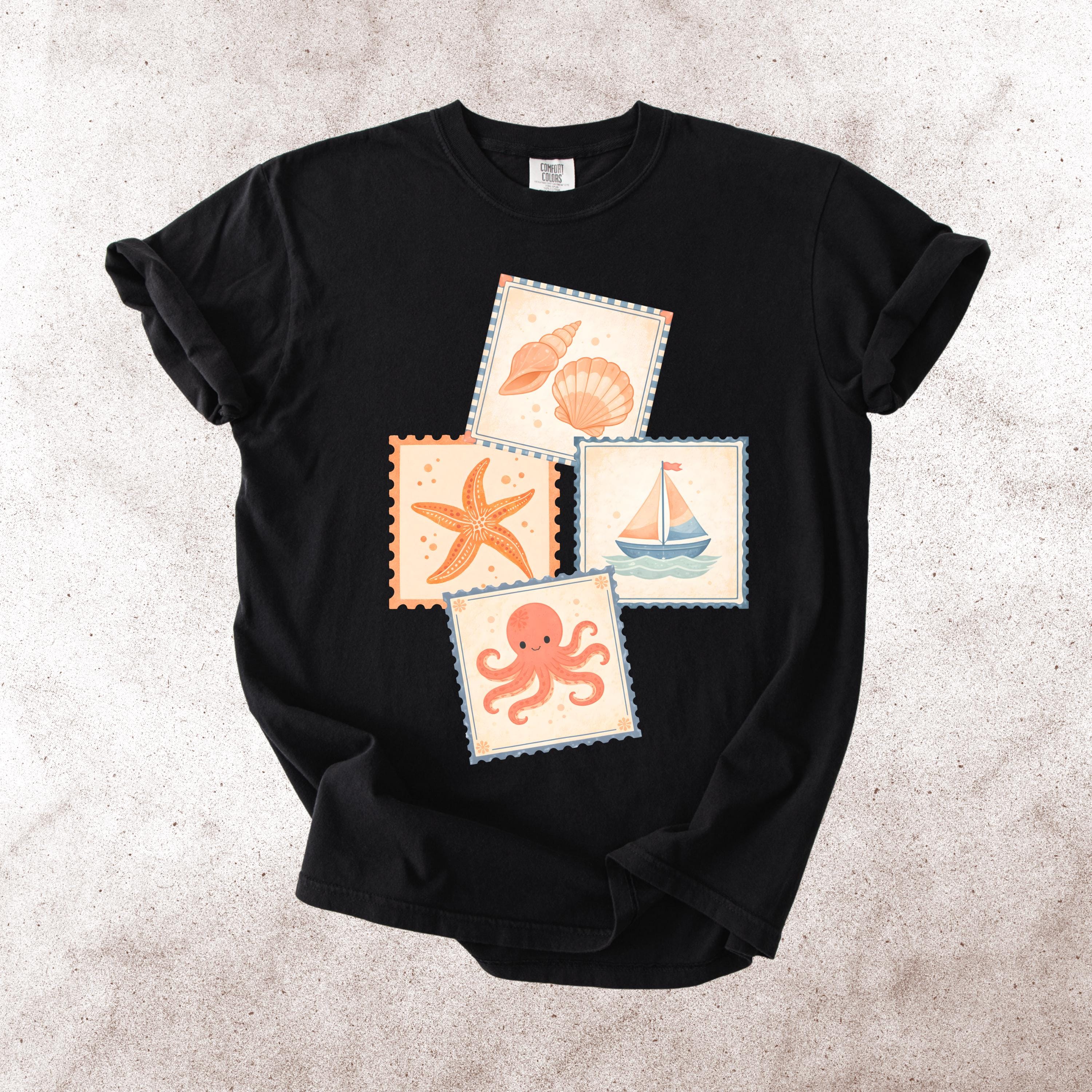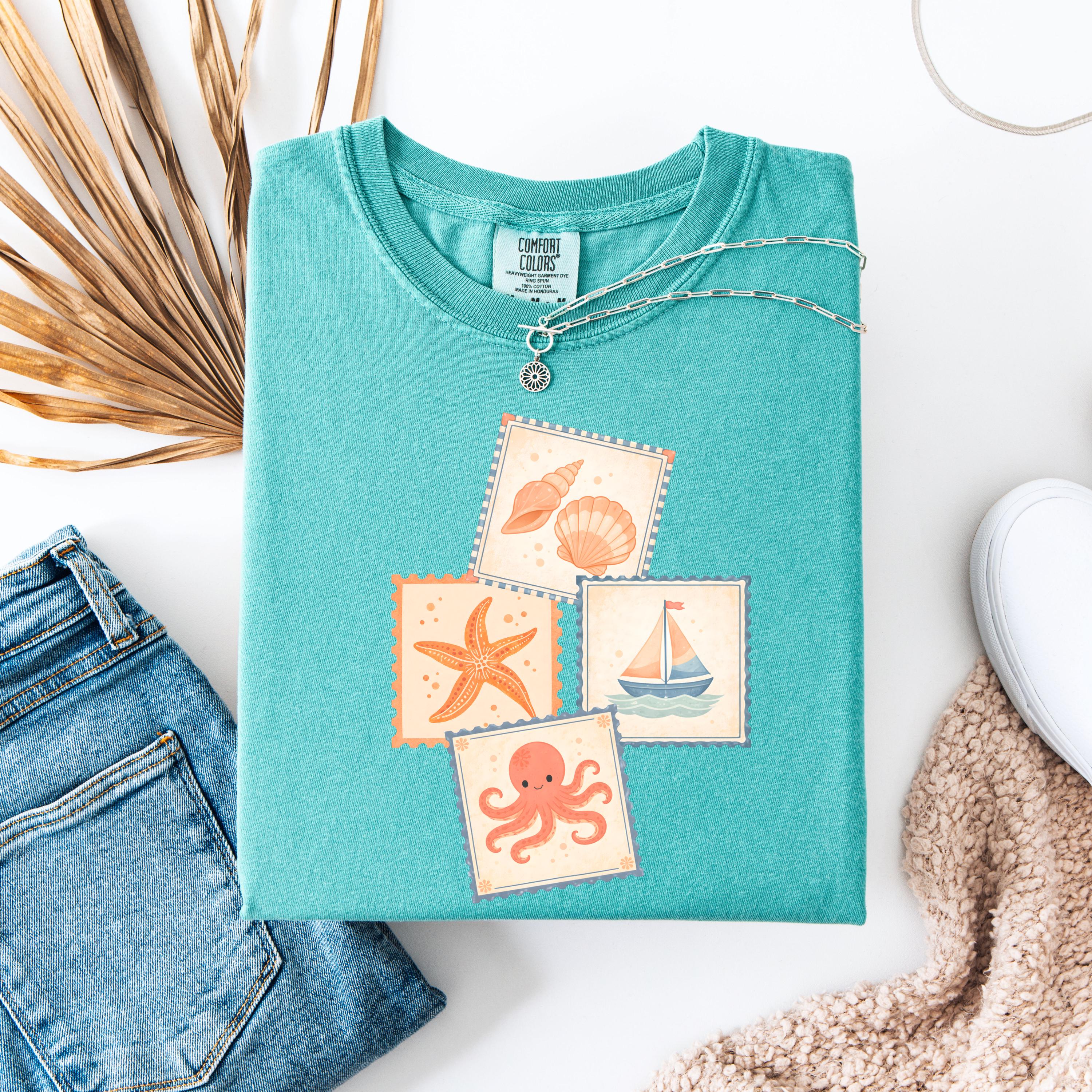 This soft, vintage-inspired design features a playful collection of coastal elements — seashells, starfish, sailboat, and a cute octopus — arranged in a charming stamp-style layout that feels like a postcard from your favorite seaside escape.