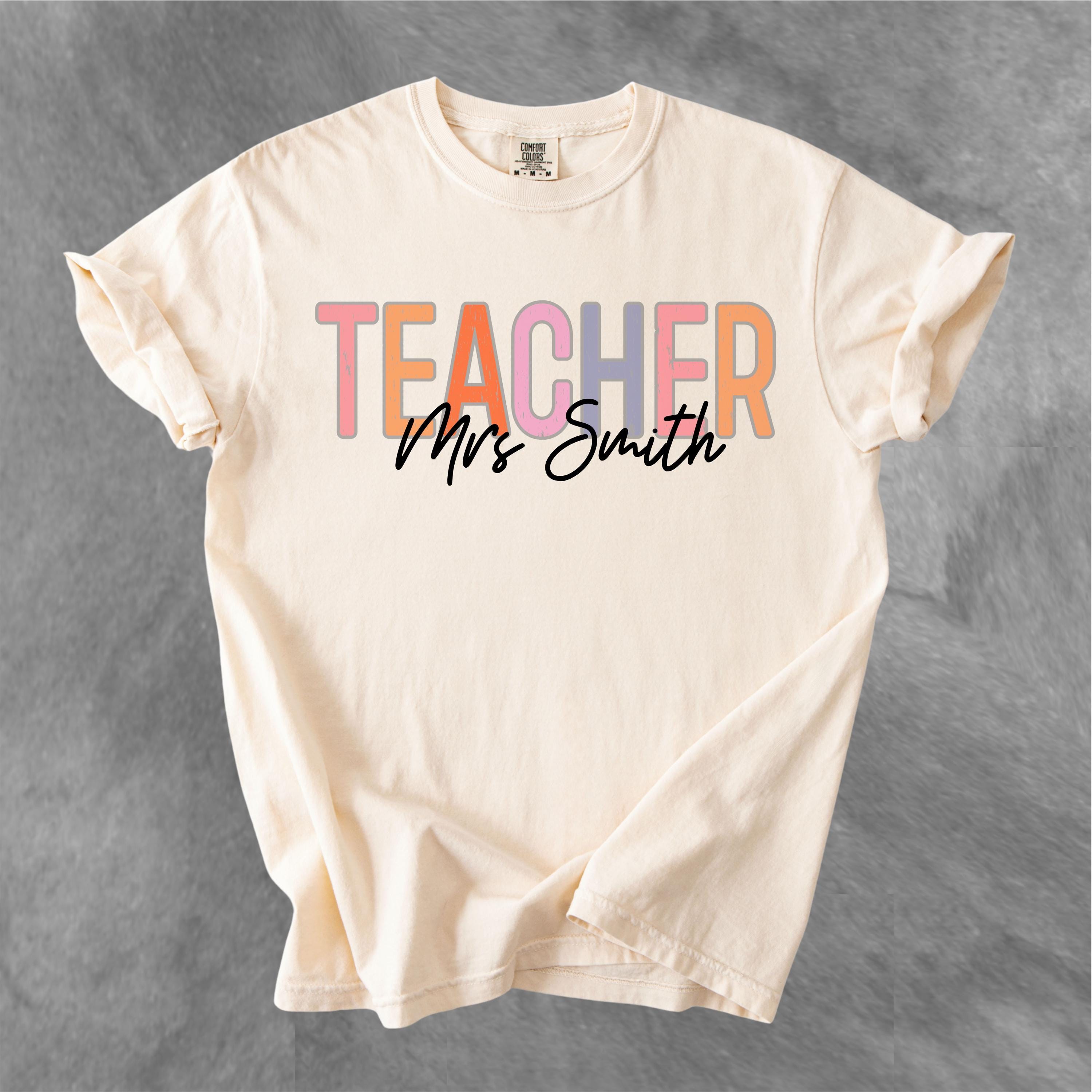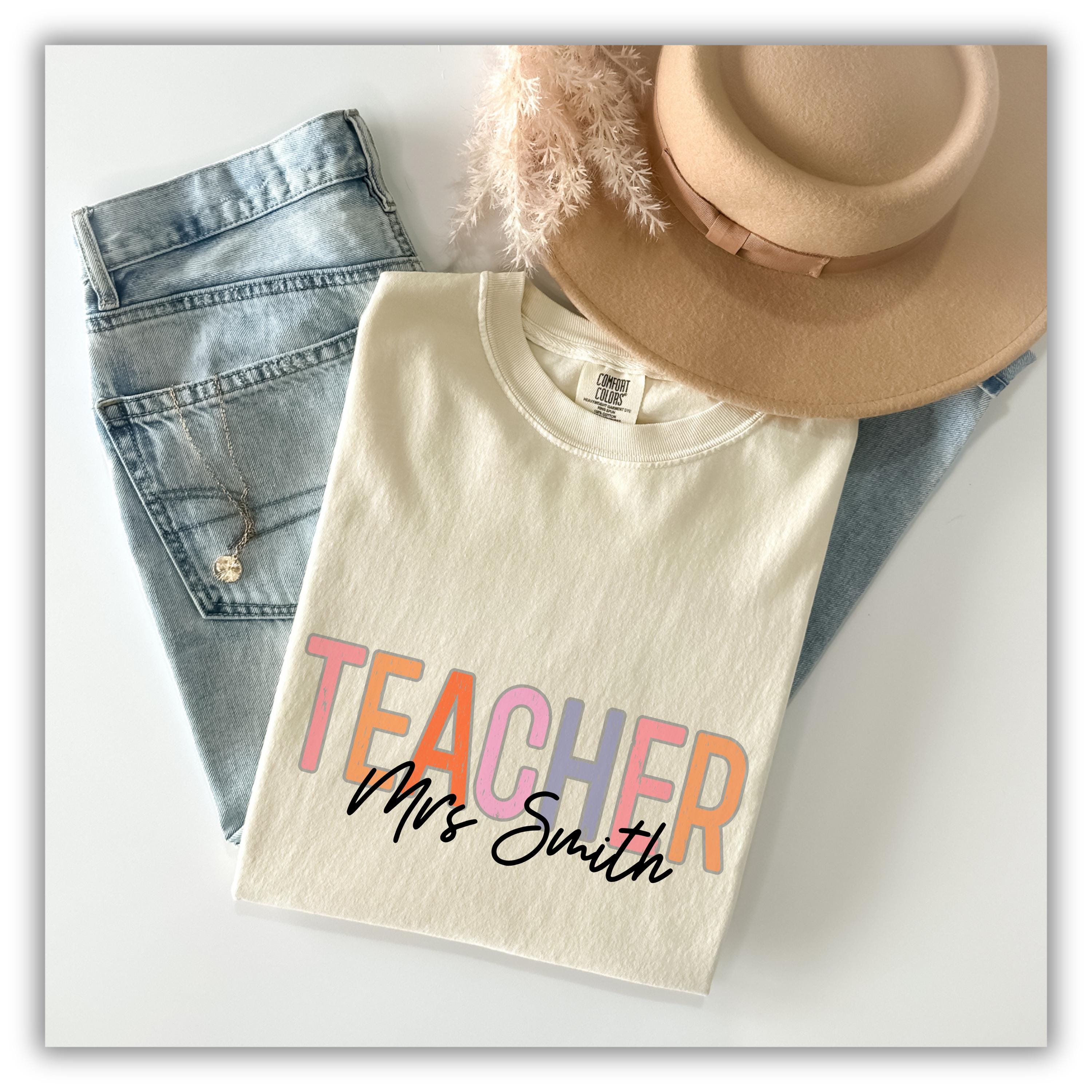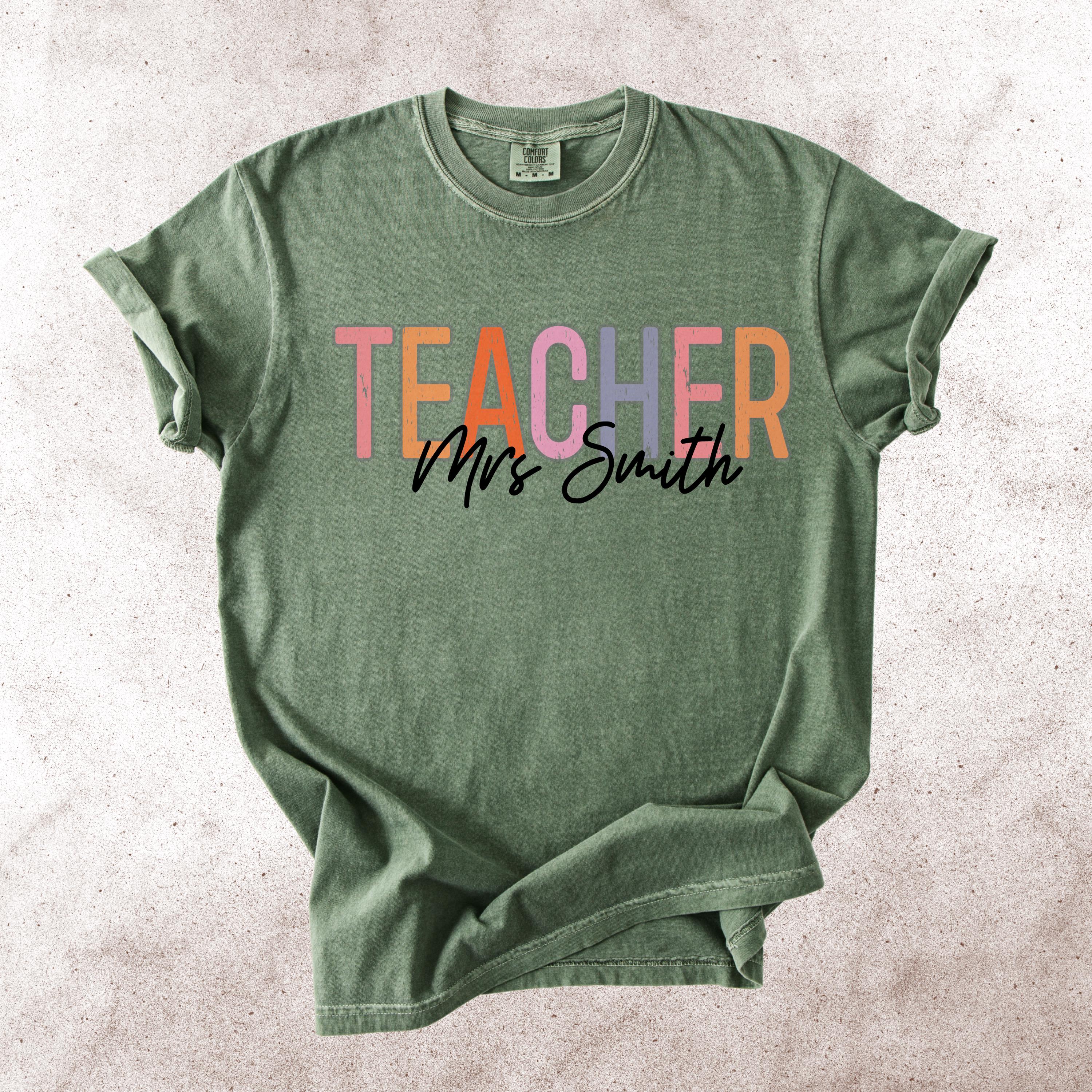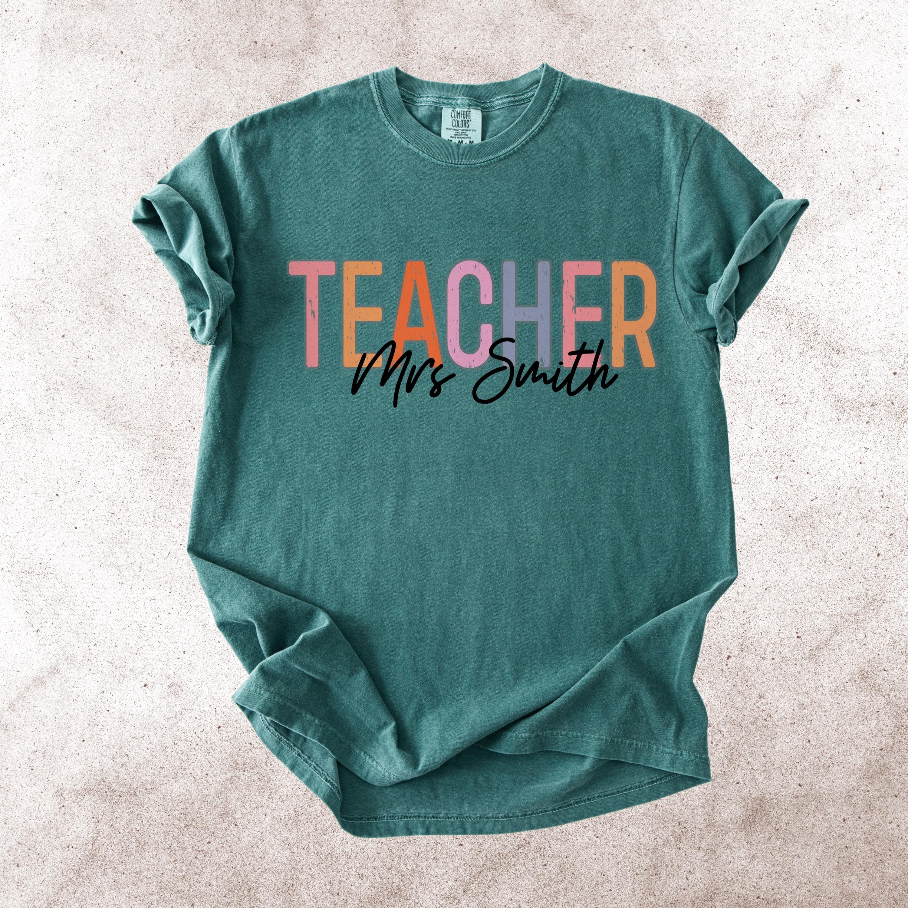 Made on high-quality comfort colors tee, this shirt offers a relaxed fit and soft feel, perfect for long school days. Great as a teacher appreciation gift, first day of school outfit, or custom teacher name shirt for educators.