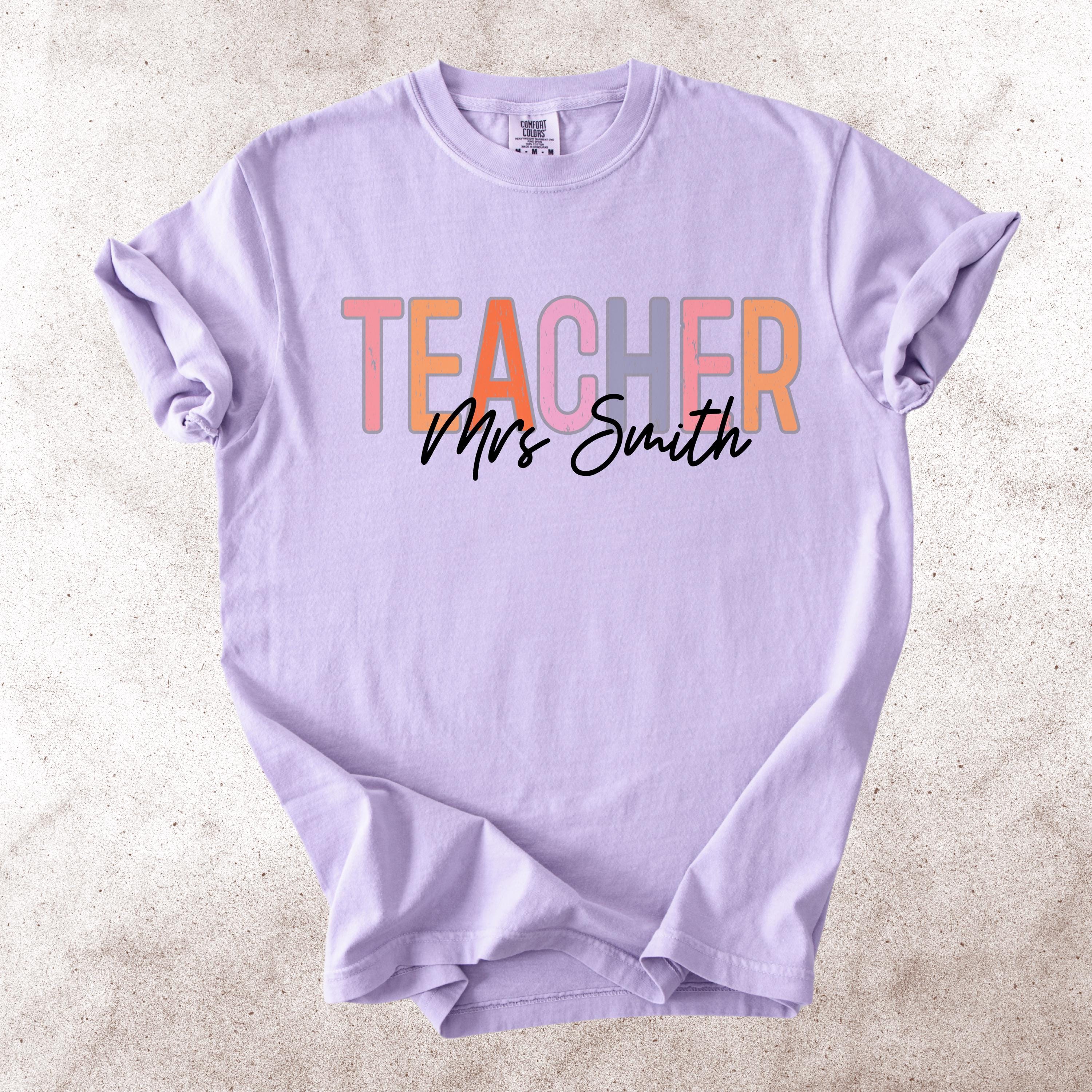 This personalized teacher shirt is a perfect back to school gift designed on premium comfort colors tee. Featuring a bold “Teacher” design with custom name detail (like Mrs Smith), it’s ideal for teachers who want a stylish yet meaningful everyday look in the classroom.