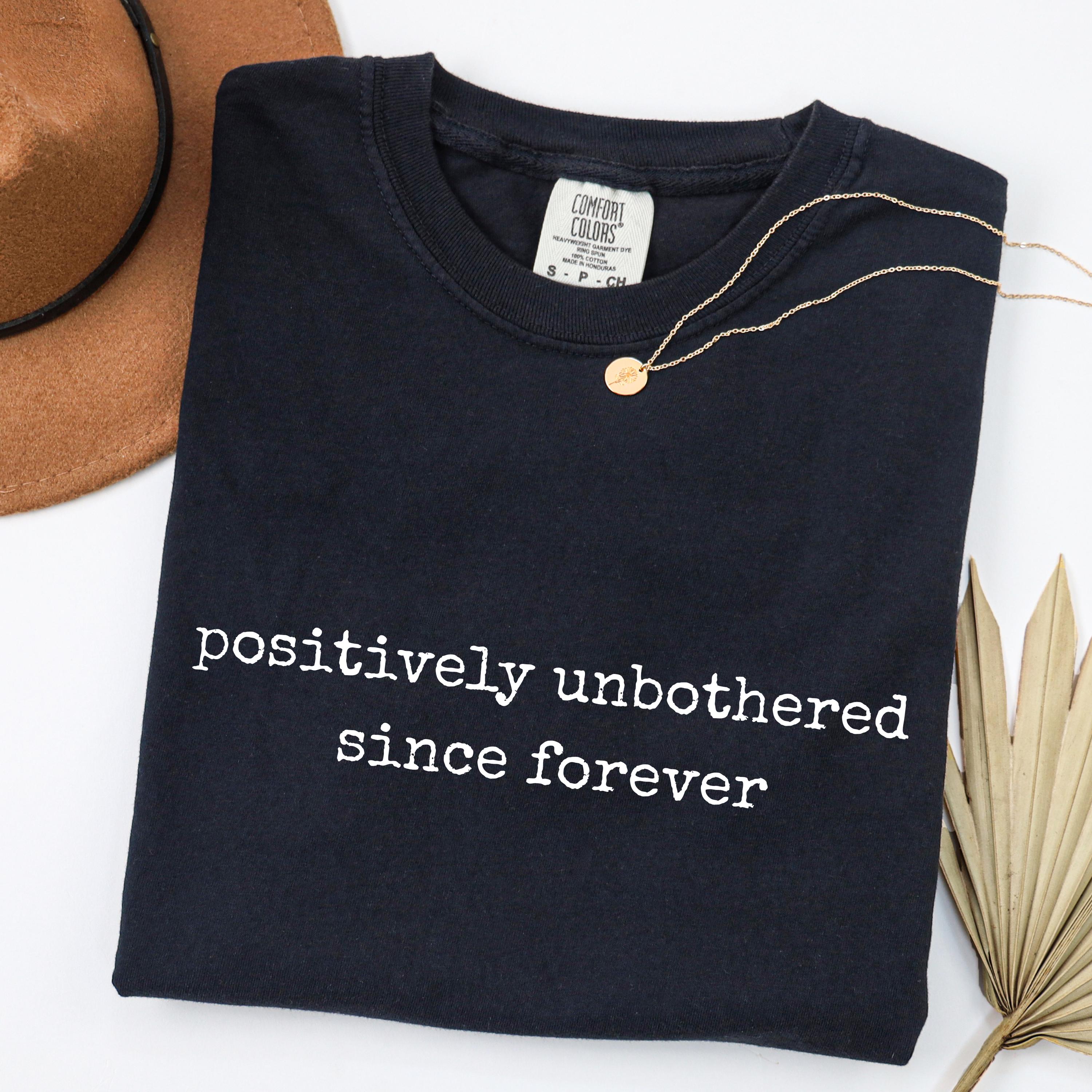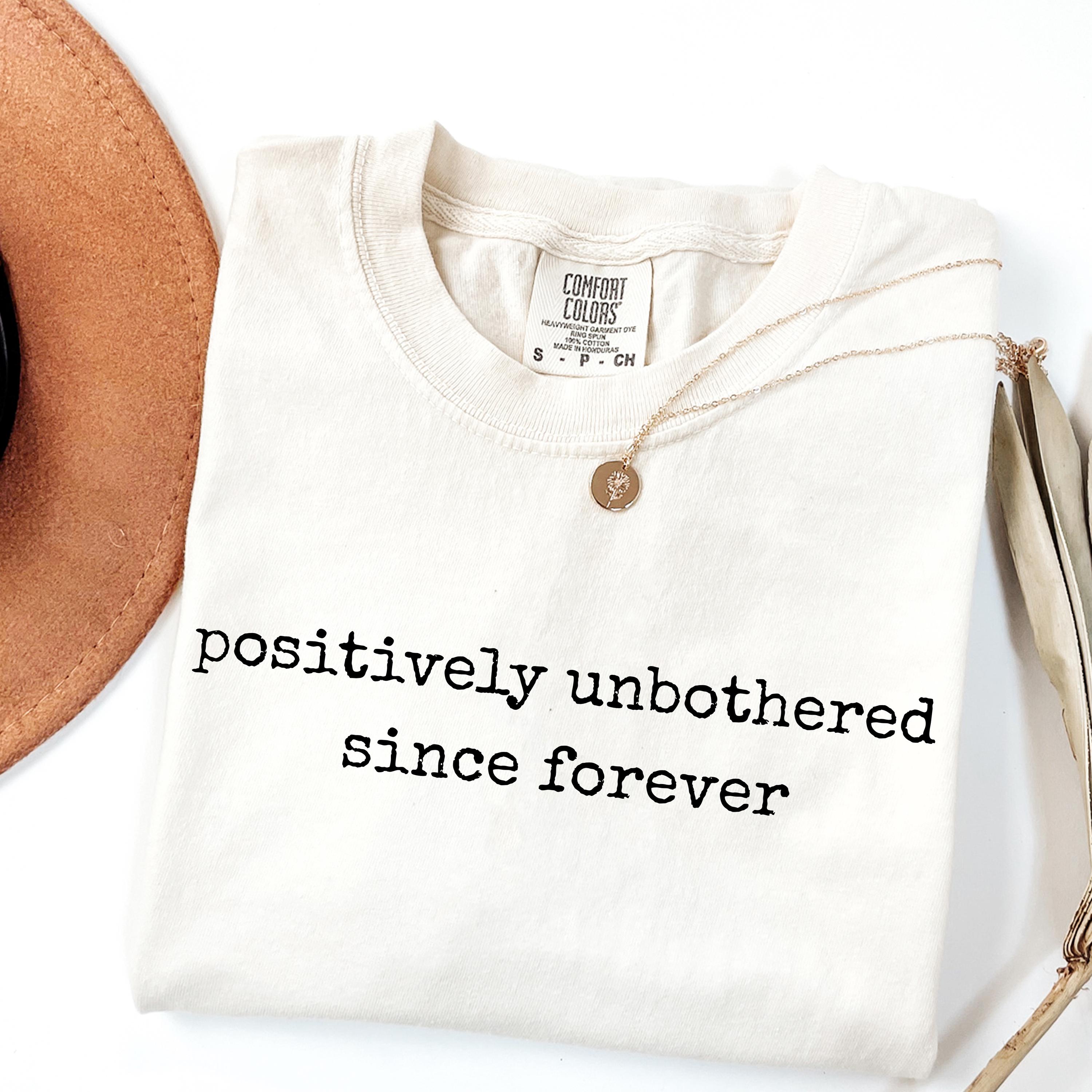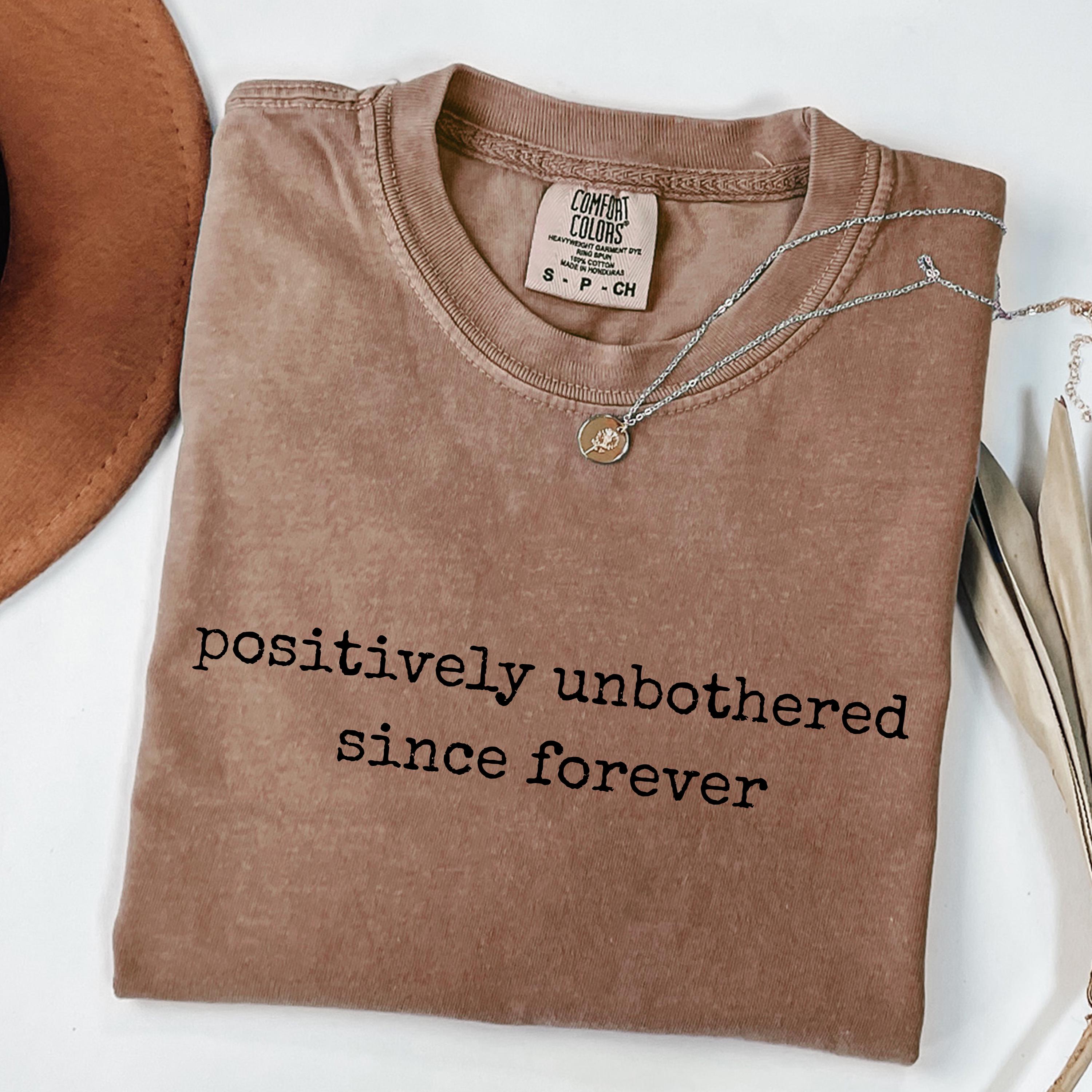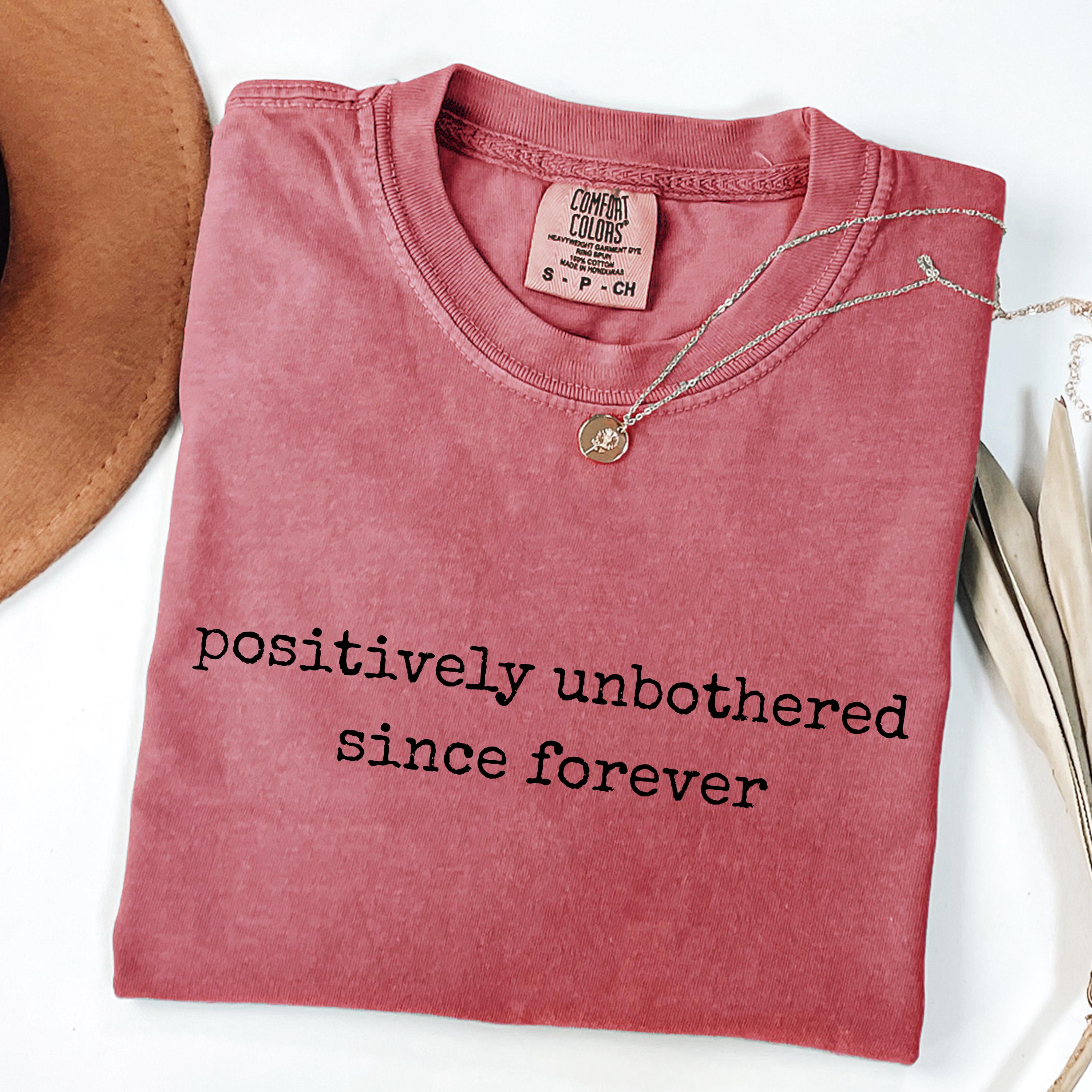 Embrace effortless confidence with this minimalist comfort colors tee featuring the phrase “positively unbothered since forever” in a vintage typewriter-style font. Designed for those who love calm energy, low-key attitude, and timeless aesthetic, this shirt blends humor with relaxed style. Perfect for everyday wear, beach days, casual outfits, or as a thoughtful gift, this adult youth comfort colors tee pairs easily with jeans, shorts, or layered looks. Its soft-washed fabric and retro-inspired typography make it a standout piece for anyone who lives unbothered and unapologetic.