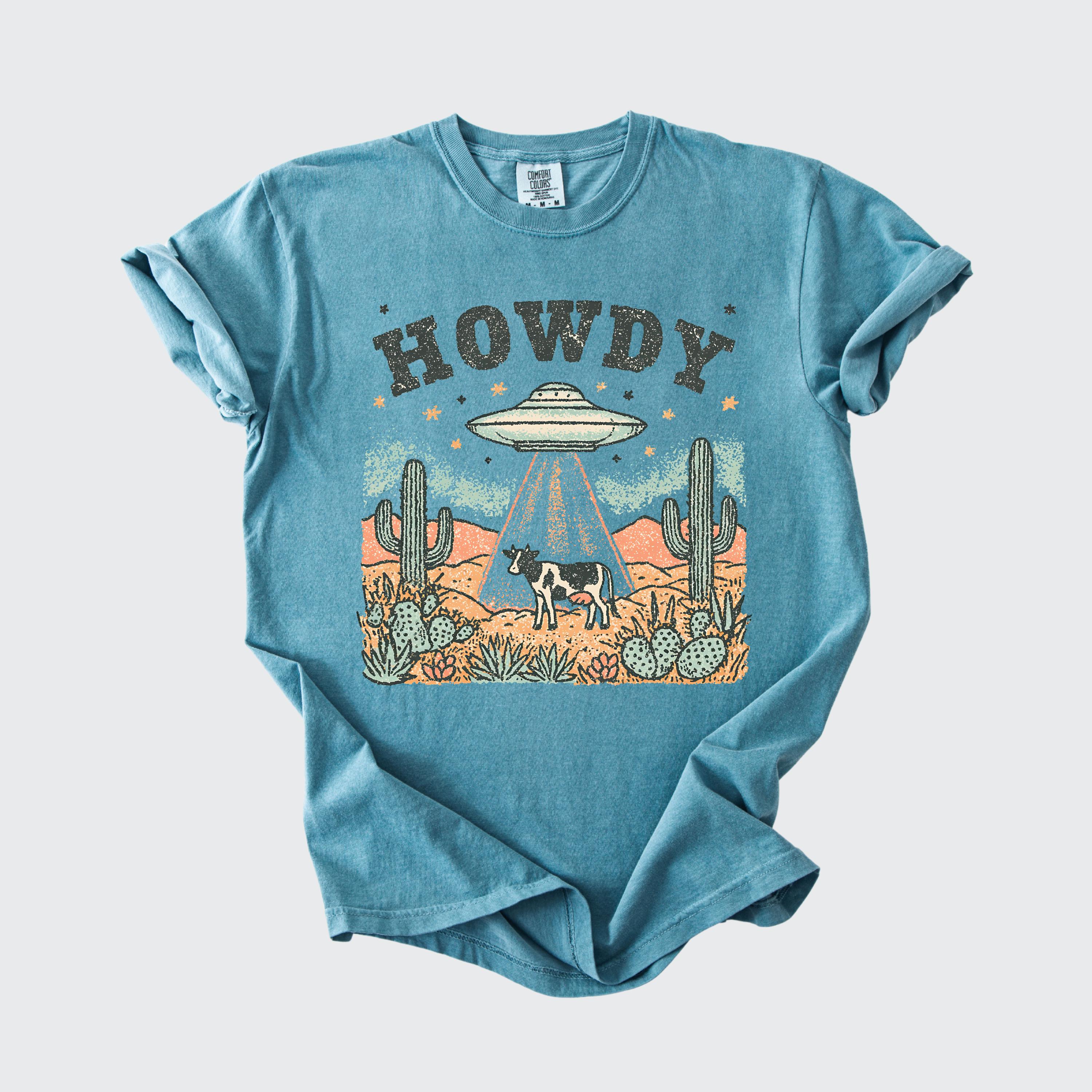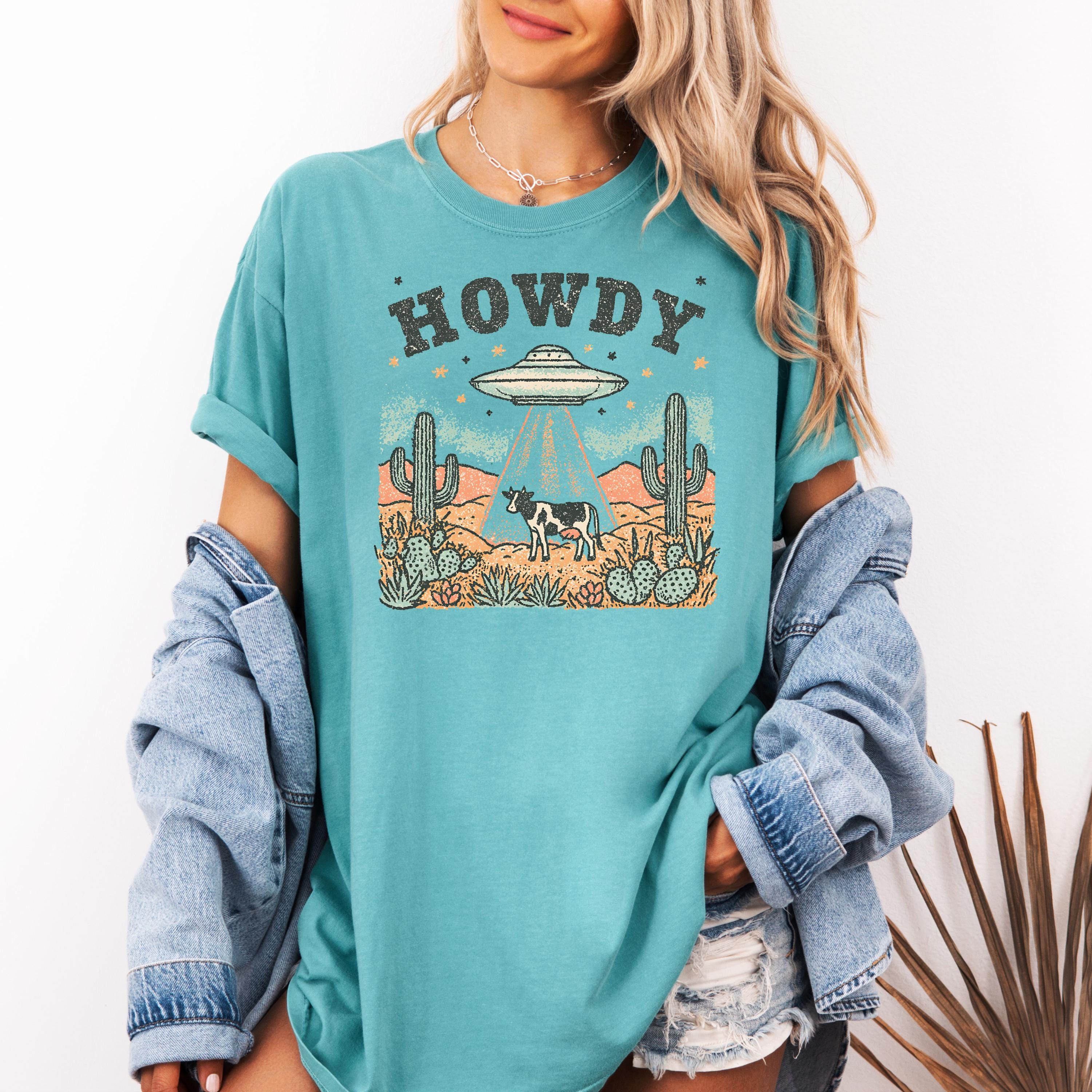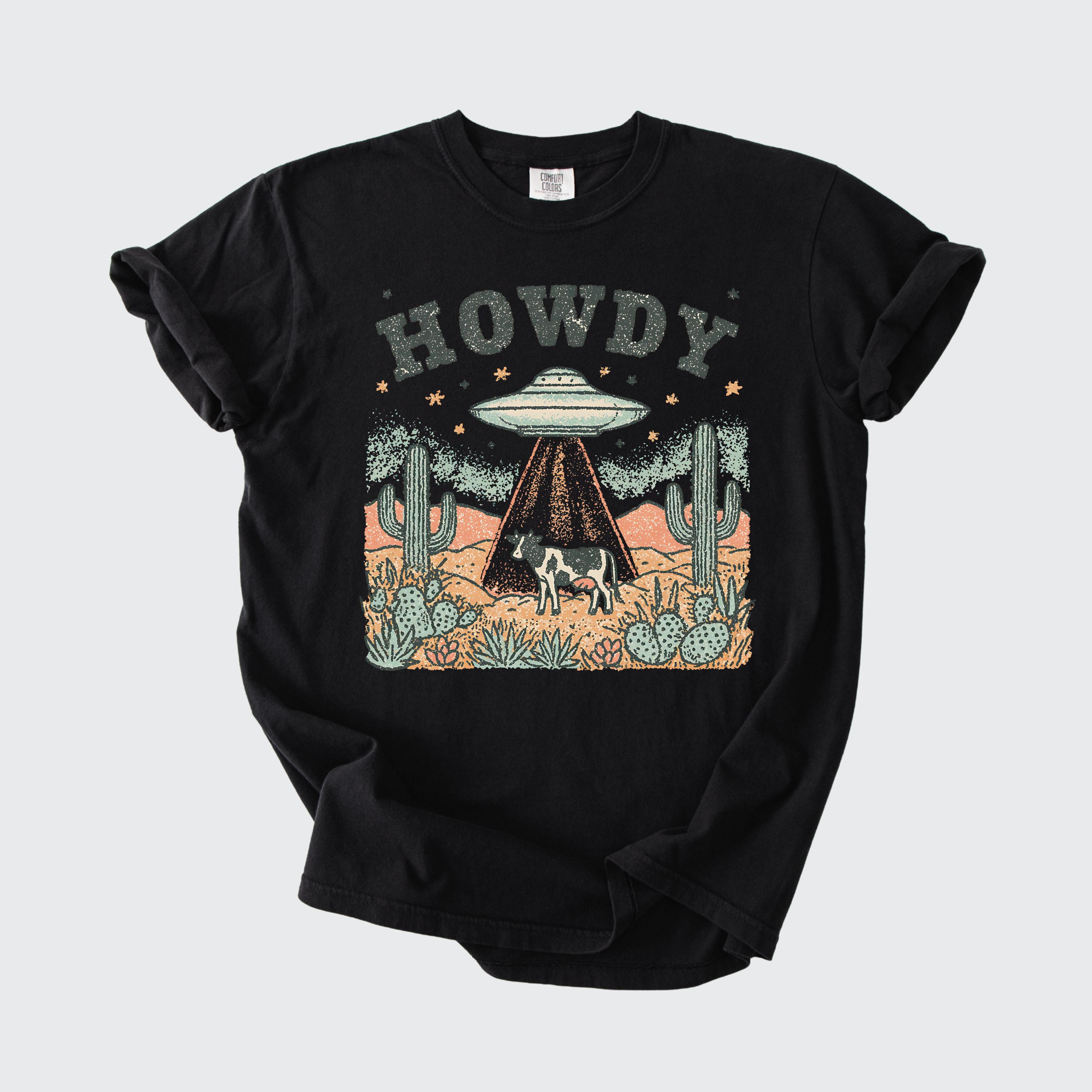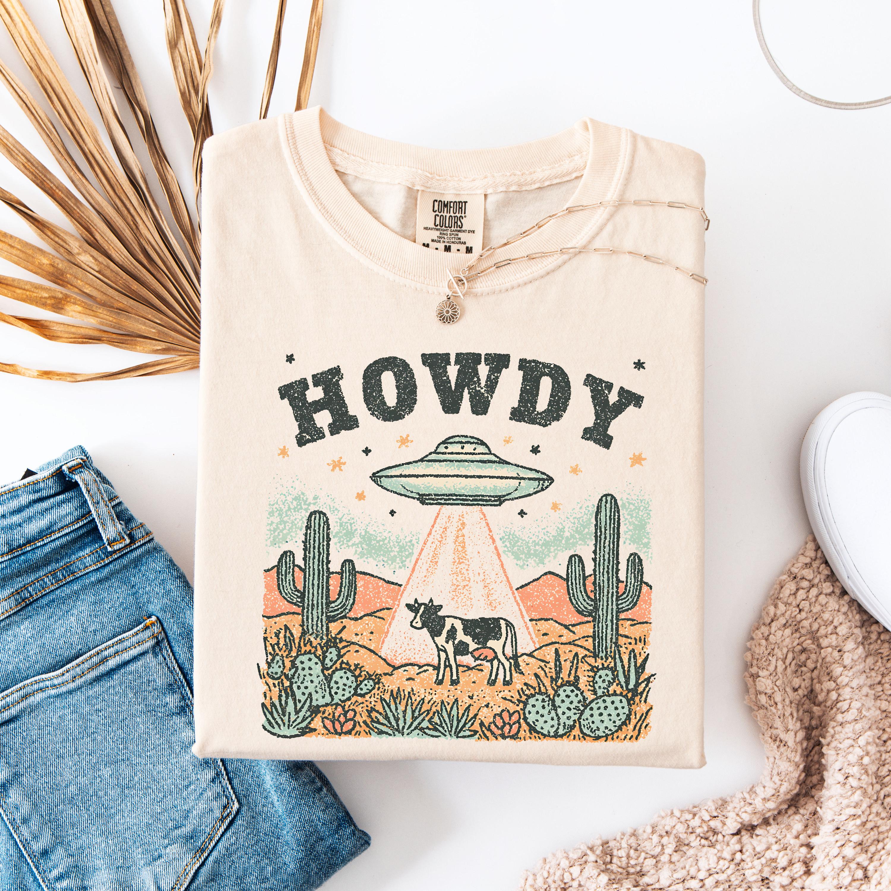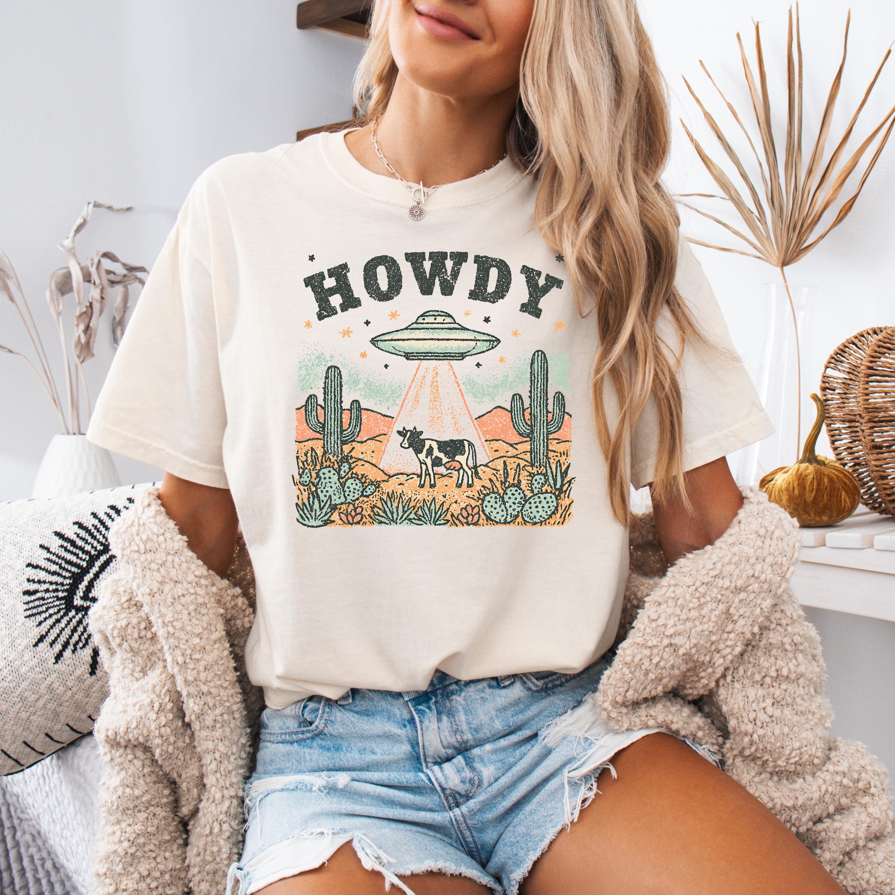 Stand out with this unique comfort colors tee featuring a “Howdy” alien cow abduction design in a western desert scene. Combining cowboy style with a fun UFO twist, this graphic tee is perfect for western lovers, cowgirl outfits, rodeo vibes, country concerts, and quirky gift ideas.