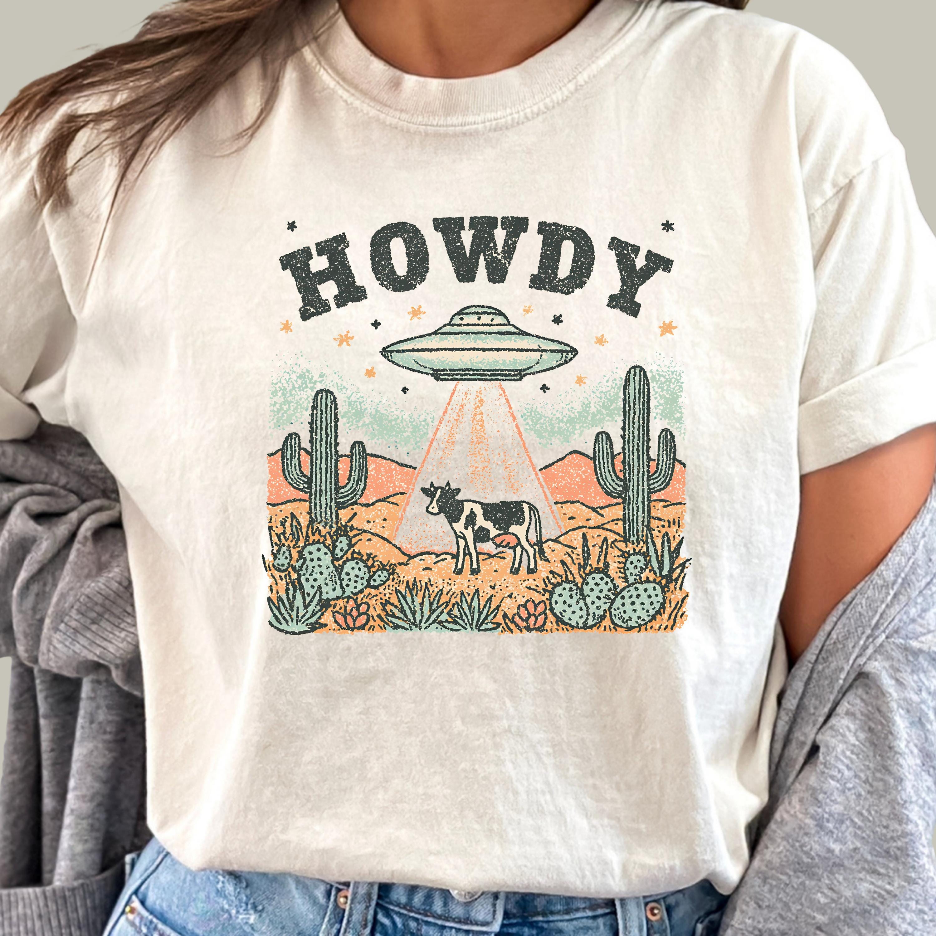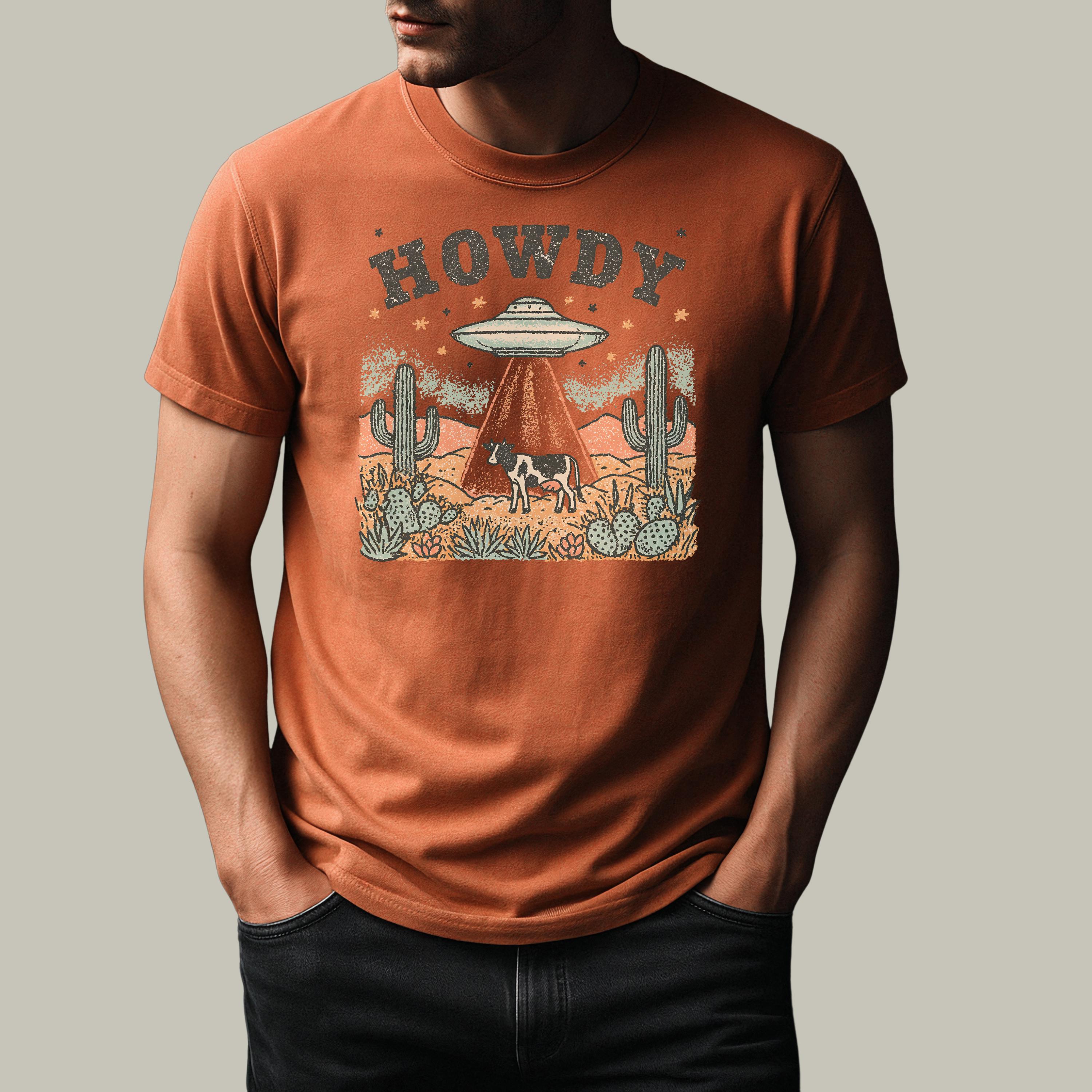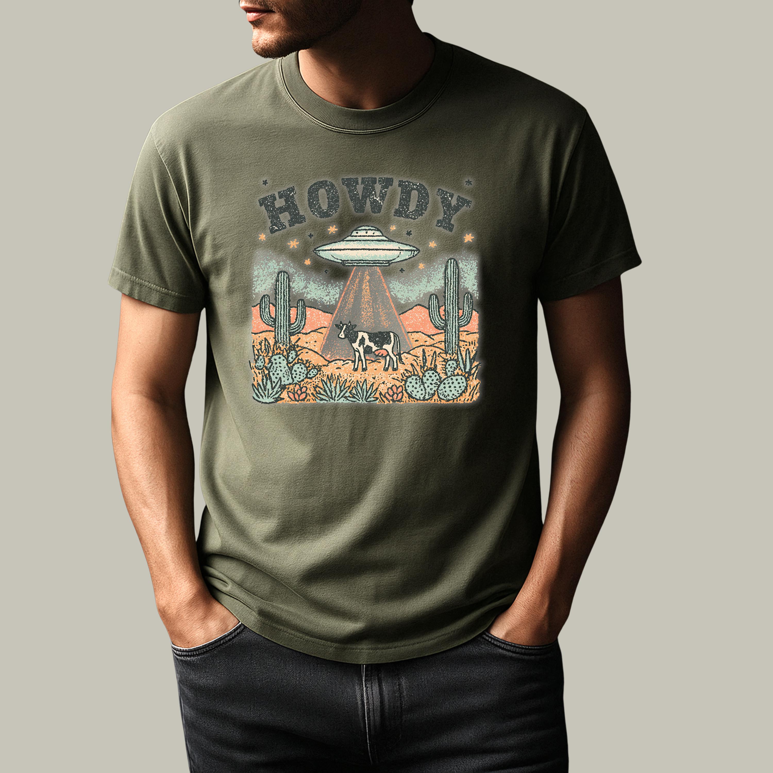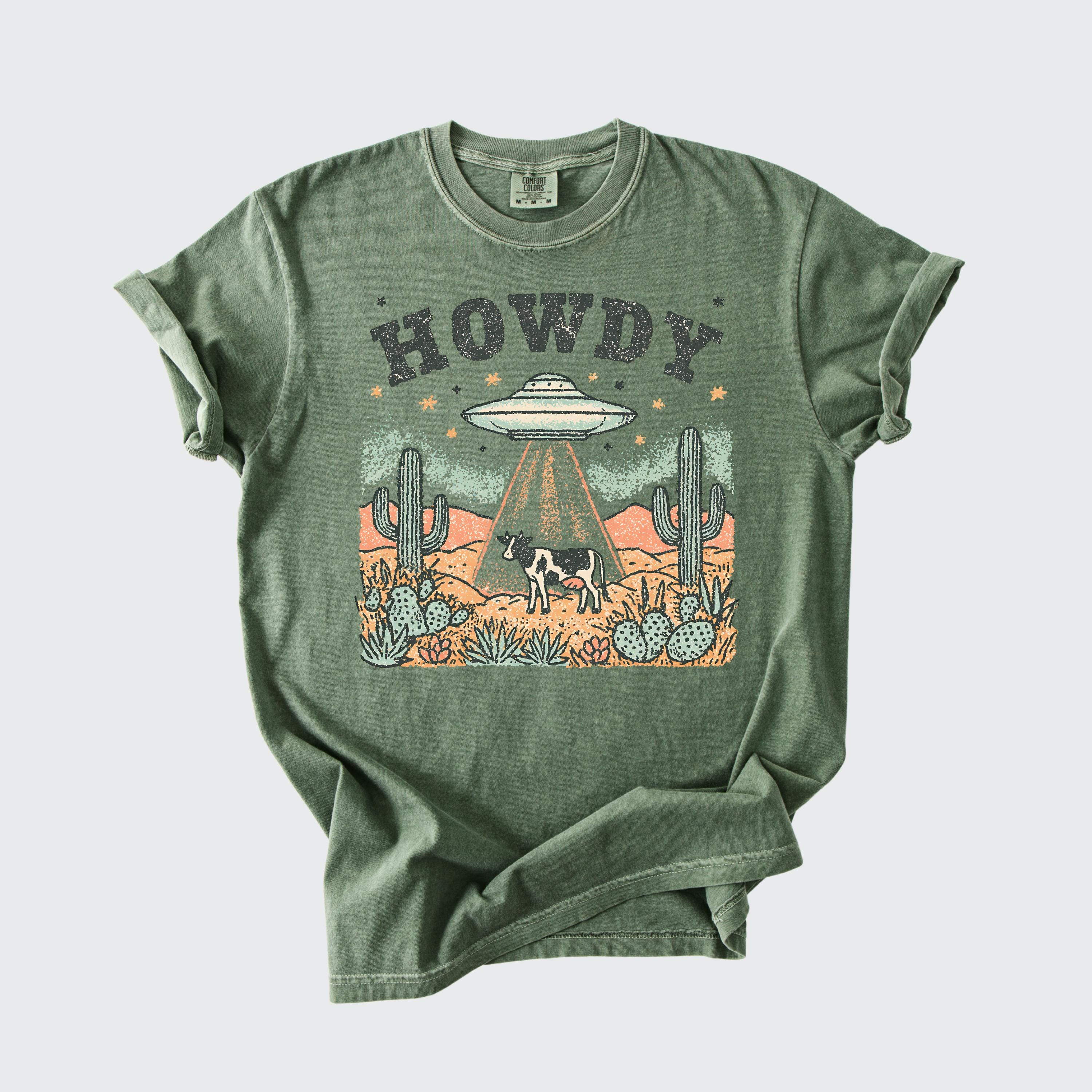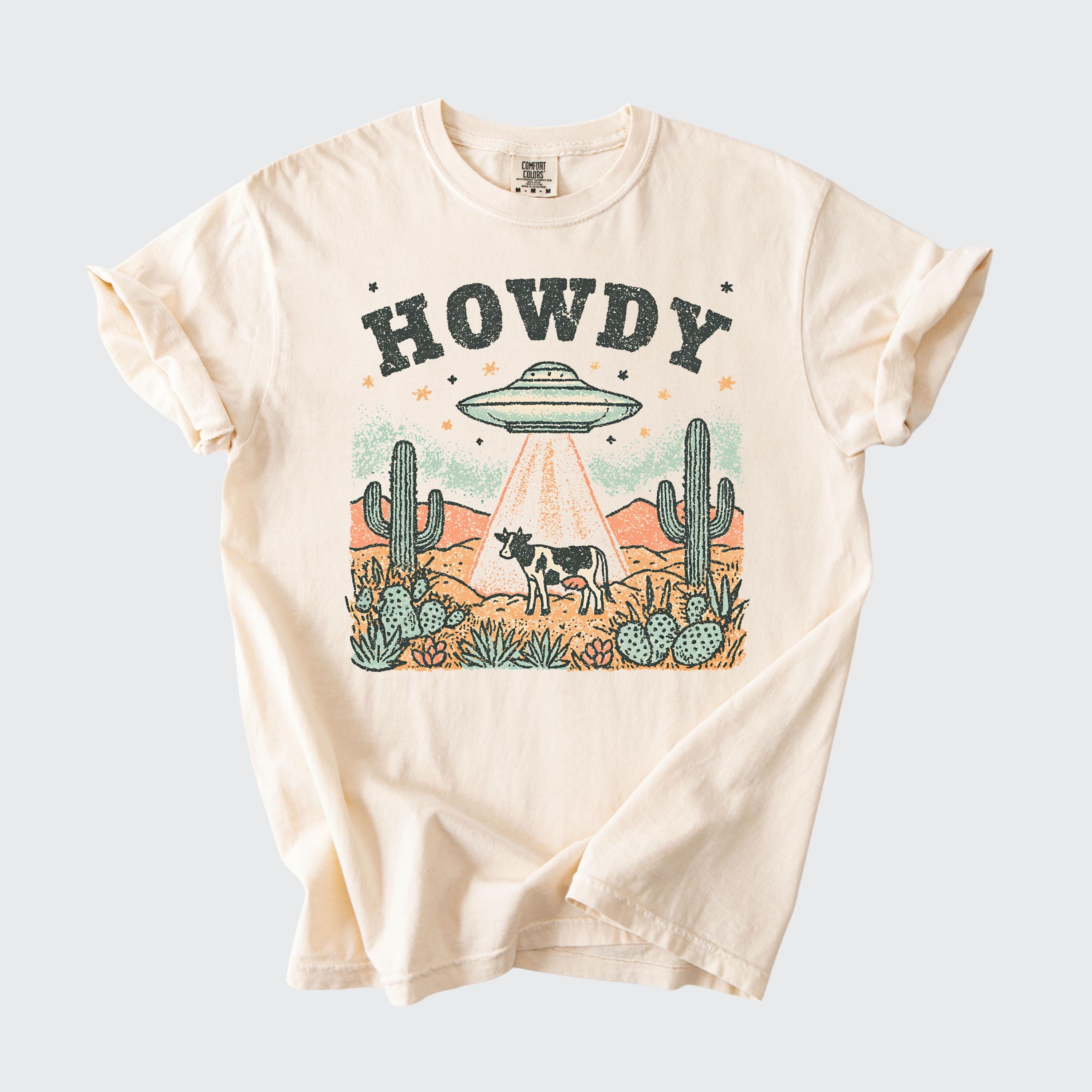 Stand out with this unique comfort colors tee featuring a “Howdy” alien cow abduction design in a western desert scene. Combining cowboy style with a fun UFO twist, this graphic tee is perfect for western lovers, cowgirl outfits, rodeo vibes, country concerts, and quirky gift ideas.