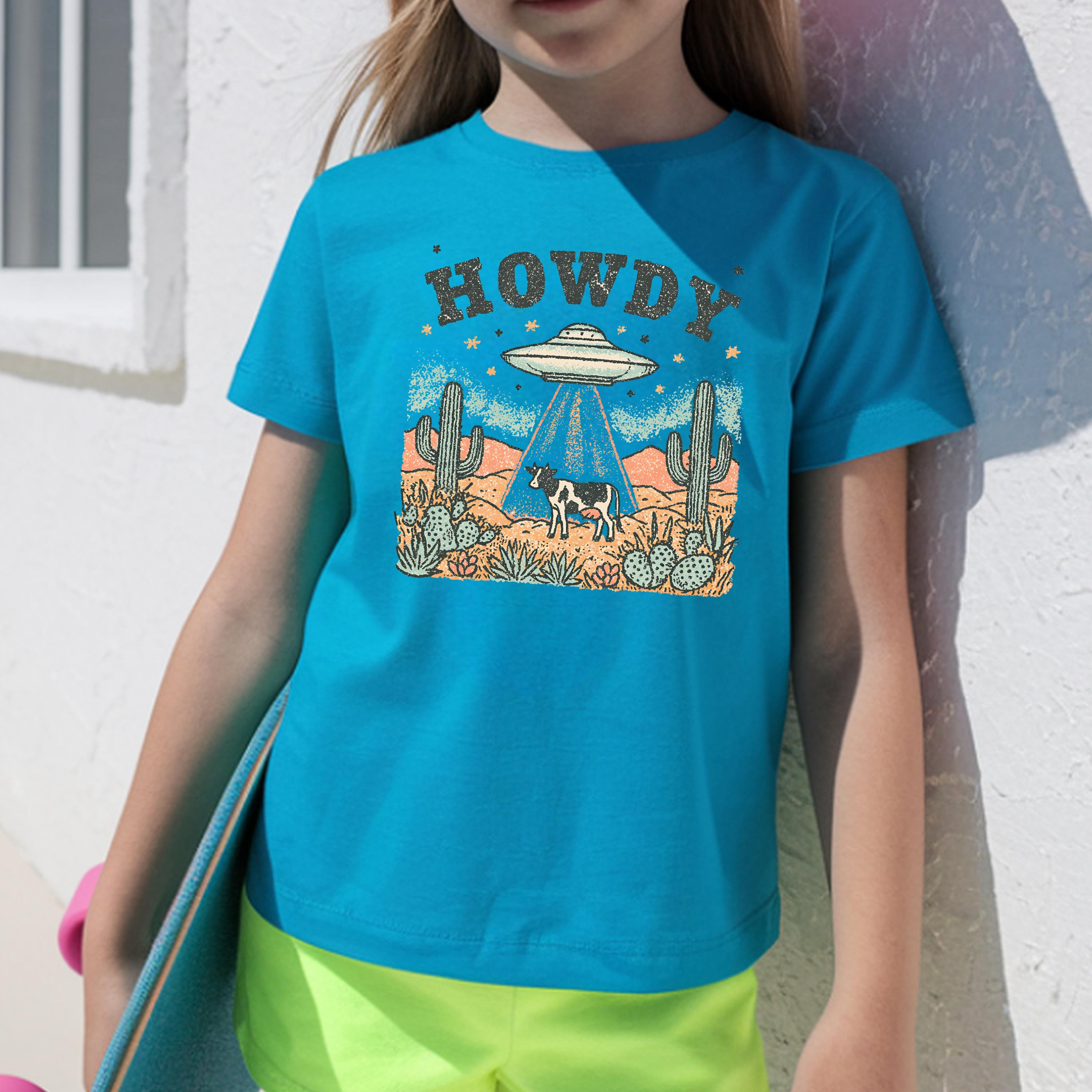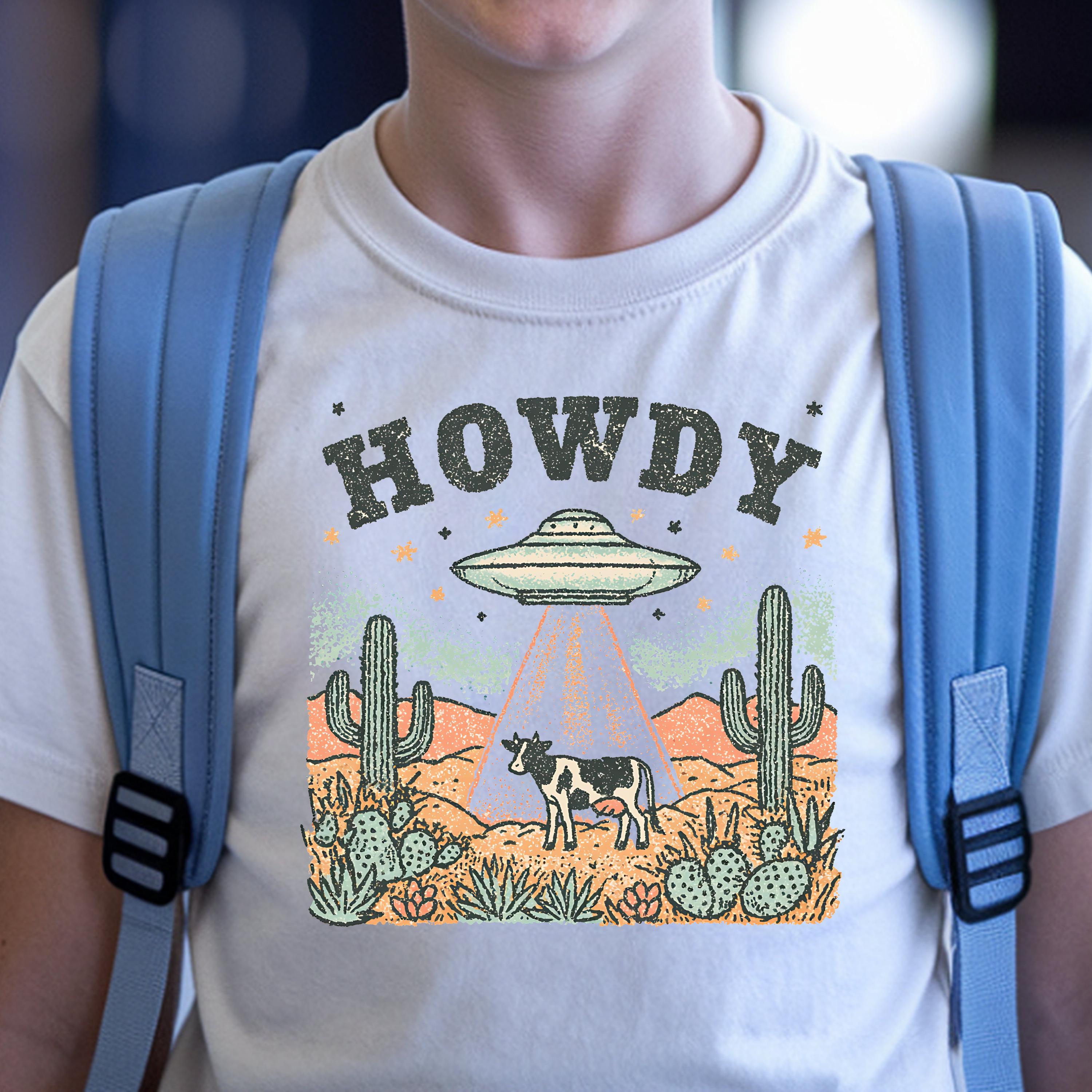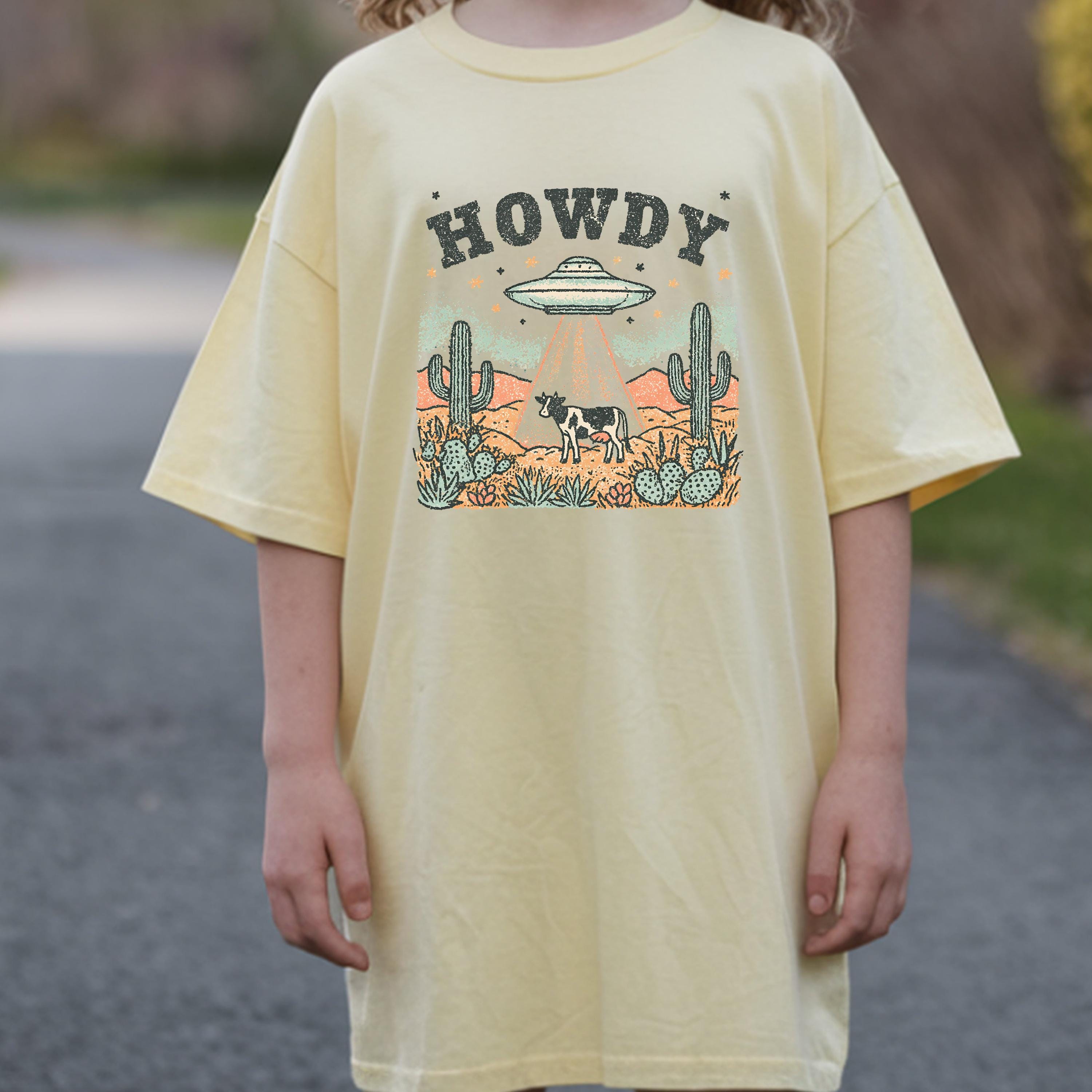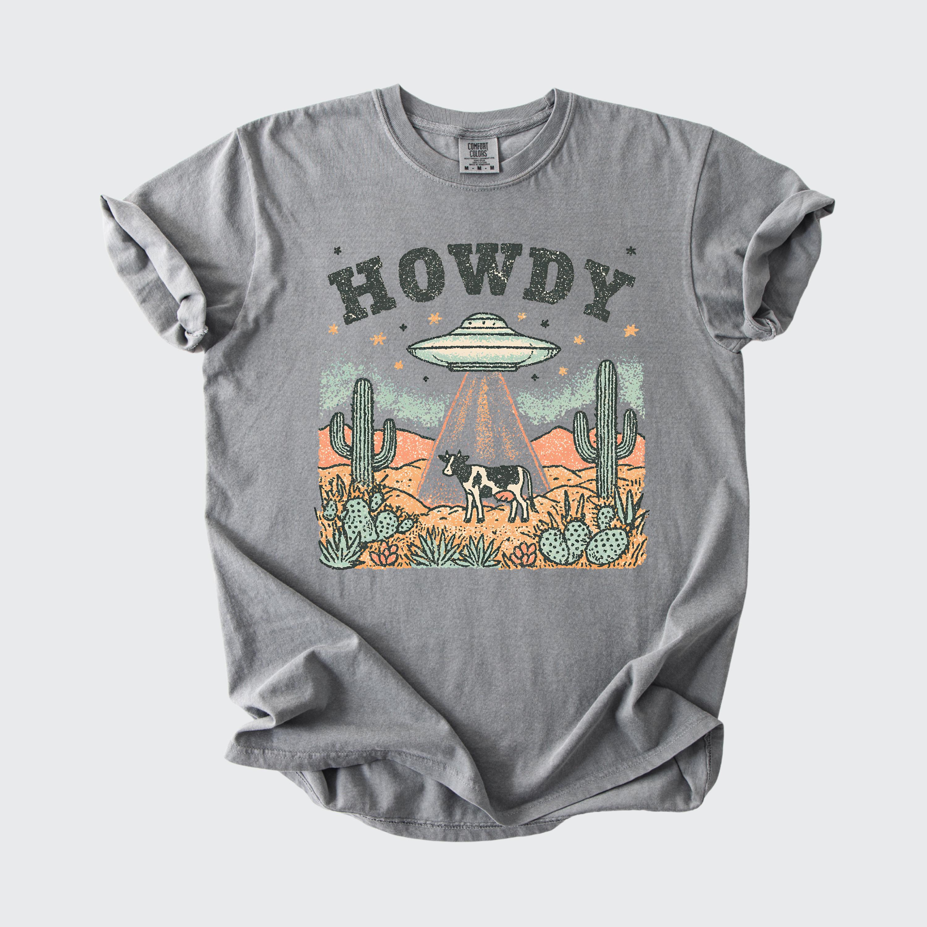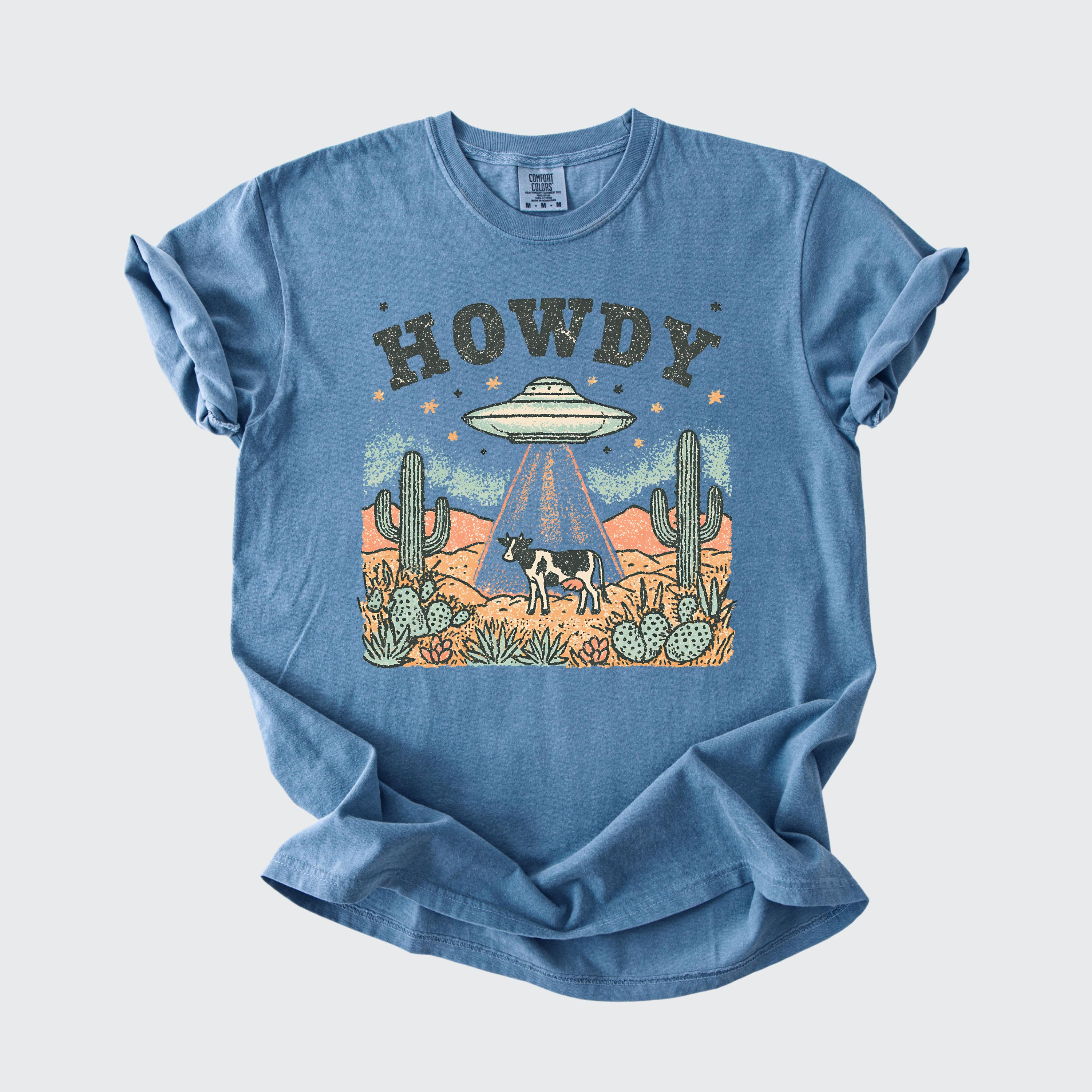 Stand out with this unique comfort colors tee featuring a “Howdy” alien cow abduction design in a western desert scene. Combining cowboy style with a fun UFO twist, this graphic tee is perfect for western lovers, cowgirl outfits, rodeo vibes, country concerts, and quirky gift ideas.